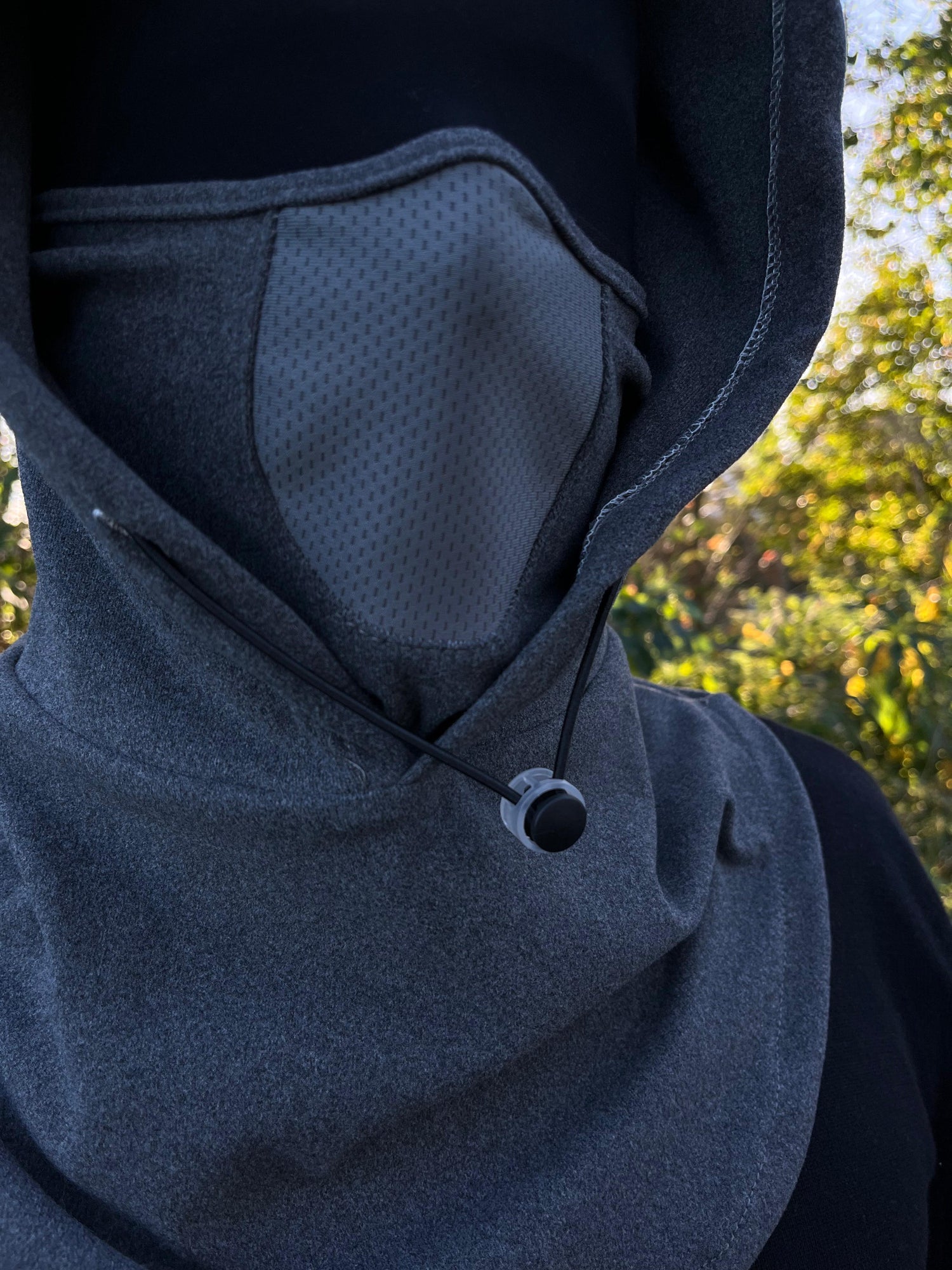 It’s designed to be universal, so anyone can wear it. Additionally, it features a drawstring to secure the hood.